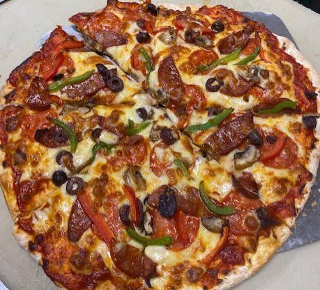 with Broccoli, Spanish Onion, Tomato, Roasted Pumpkin, Fetta, Mushrooms, Artichoke, Capsicum, Olives, and Cheese, drizzled with Peri-Peri Mayo